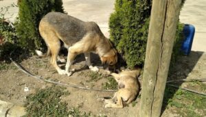 Amasya’da yavru bir köpeğe bir araç çarptı. Kaza sonucu bacakları kırılan yavru köpeğin annesi, o anlarda yavrusunun başından bir an olsun ayrılmadı.