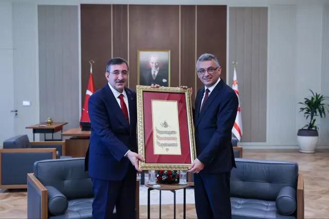 Cumhurbaşkanı Yardımcısı Cevdet Yılmaz, Kuzey Kıbrıs Türk Cumhuriyeti (KKTC) Cumhurbaşkanlığı Yerleşkesi’nde gerçekleştirilen devir teslim töreninin ardından, resmi olarak görevine başlayan KKTC’nin 6. Cumhurbaşkanı Tufan Erhürman ile makamında bir araya geldi.