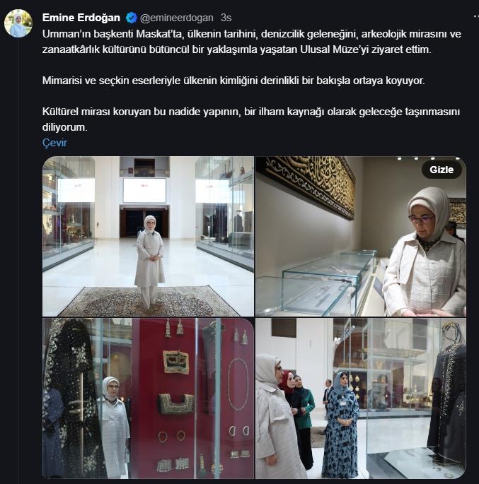 Emine Erdoğan, müzede yer alan “Toprak ve İnsan”, “Denizcilik Tarihi”, “Silahlar ve Zırhlar”, “Medeniyetin Oluşumu” ve “Para Birimleri Zaman Çizelgesi” gibi galerilerde sergilenen eserler hakkında yetkililerden bilgi aldı. Ziyaret sonrasında, sosyal medya hesabından yaptığı paylaşımda Emine Erdoğan, müzenin Umman’ın tarihini, denizcilik geleneğini, arkeolojik mirasını ve zanaatkarlık kültürünü bütüncül bir yaklaşımla yansıttığını belirtti. Aynı zamanda, yapılan paylaşımda müzenin mimarisi ve içerdiği seçkin eserlerle ülkenin kimliğini derinlemesine yansıttığı vurgulandı.