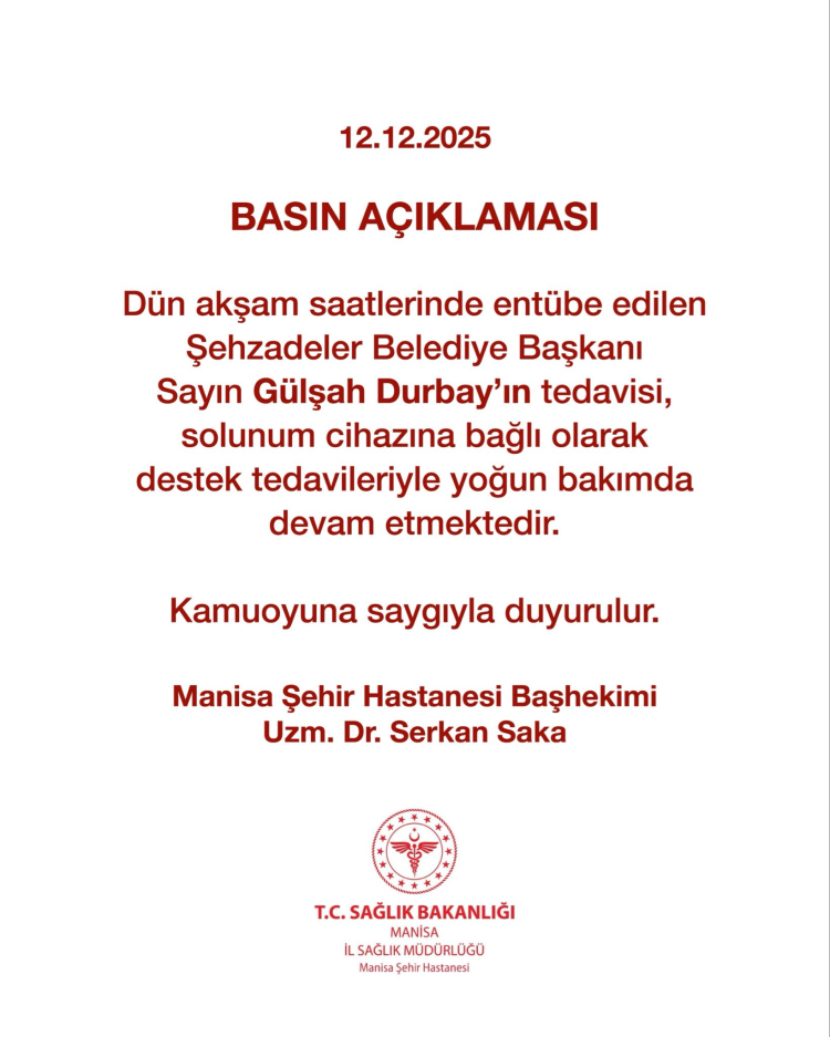 Manisa Şehir Hastanesi Başhekimi Uzm. Dr. Serkan Saka, Şehzadeler Belediye Başkanı Gülşah Durbay’ın sağlık durumuna ilişkin açıklama yaptı.